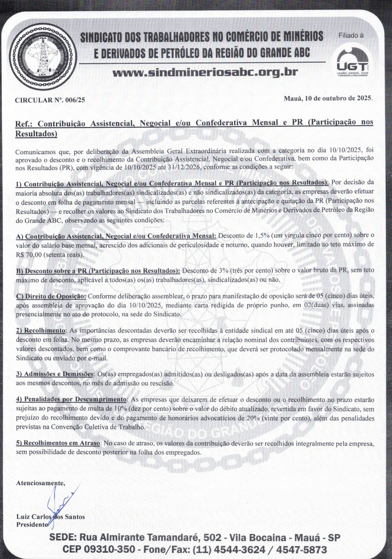 Circular 006/2025 | Contribuição Assistencial, Negocial e/ou Confederativa Mensal e PR